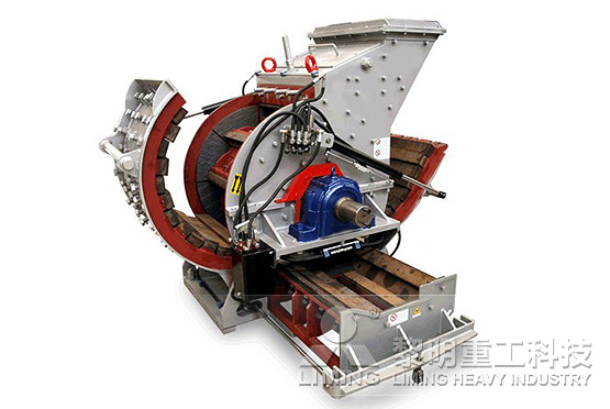 主機通過電機、三角皮帶帶動主軸,從而使轉子旋轉,錘頭受到旋轉時所產生的離心力向四周伸開,大塊物料從進料口進入破碎腔之后,便被高速運動的錘子擊碎。破碎合格的物料則由下部有縫隙的蓖條排出,不合格的則留在破碎腔內,被錘子和承擊鐵塊反復作用,直至能夠合格排出。為避免堵塞,被粉碎物料的含水量一般不超過5%。